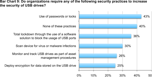 In addition, a large number of respondents say their organization is not required to adopt the following security practices to increase the security of USB drives: use passwords or locks, total lockdown through the use of a software solution to block the usage of USB ports, scan devices for virus or malware infections, monitor and track USB drives as part of asset management procedures, and deploy encryption for data stored on the USB drive.