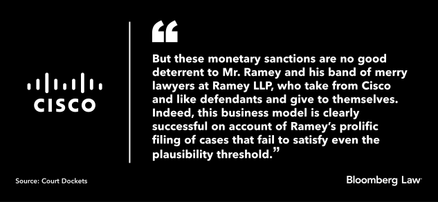 Sanctions “are no good deterrent to Mr. Ramey and his band of merry lawyers at Ramey LLP, who take from Cisco and like defendants and give to themselves,” the company’s attorneys wrote. “Indeed, this business model is clearly successful on account of Ramey’s prolific filing of cases that fail to satisfy even the plausibility threshold.”