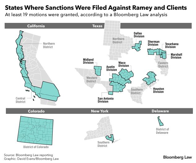 His firm has received notices about not having permission to practice in the Middle District of North Carolina and the Northern District of Georgia, as well as in California, according to a Bloomberg Law analysis of court records. A judge in the Southern District of New York is considering Google’s $124,000 sanction bid that argues Ramey didn’t request permission to practice in that court.