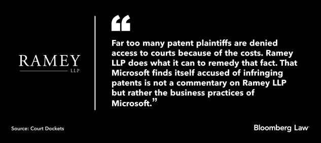 In a video interview with Bloomberg Law, Ramey described his practice as a “crusade” against corporations willing to do anything to stop patent plaintiffs of modest means.