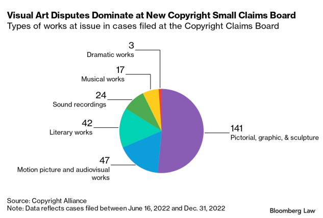 More than 80% of the 281 claims filed at the CCB through Dec. 31 involved infringement claims, according to data compiled by the Copyright Alliance, with more than half of those dealing with pictorial, graphic, and sculpture works. Motion picture and audiovisual works represented 16.7% of claims, according to the alliance, which represents the interests of more than 2 million individual creators and 15,000 organizations.