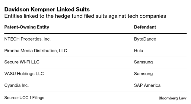 Audio Pod isn’t the only patent-owning entity with ties to Davidson Kempner, public filings show. Davidson Kempner is linked to five other patent-owning entities that have sued major technology companies including Samsung, Hulu, and TikTok owner ByteDance.