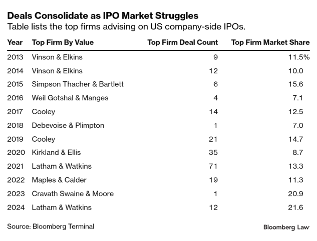 The leading market share figures have grown in the past two years, however, as the overall IPO market significantly contracted. Latham grabbed a 22% market share on the company side this year, and Cravath Swaine & Moore held 21% of the market in 2023—thanks to its work on a single megadeal that raised $4.37 billion (Johnson & Johnson’s healthcare unit Kenvue Inc.).
