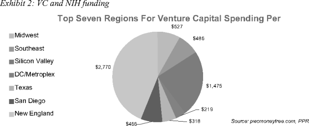 Biotechnology has been a key beneficiary of VC spending in the last 10 years (1999–2008), attracting investment of more than $7 billion. That tally ranks fifth of the 17 categories tracked by PwC. However, over the five years ending in 2008, biotech ranked only third for VC capital flows, with nearly $4 billion, after software and industrial/energy. In addition, biotech continues to grab a larger piece of the VC pie. This support, along with the priorities set in Washington, bode well for growth. In the American Recovery and Reinvestment Act, $9.5 billion was allocated for spending by NIH for biomedical research, while another $2.5 billion was allocated to the National Science Foundation for research. These funds dwarf what the VC has spent in biotech over the past decade, and ancillary benefits and job growth in key biotech hubs along the coasts should be expected. But growth is likely to come from more than just the coasts. Exhibit 2 shows VC spending and NIH allocations (for 2007, the last year of complete data tallies) per capita, based on PwC’s VC regions. VC spending is concentrated in the top biotech hubs (which bodes well for job growth and new company startups), while NIH funding is spread out far more evenly (which bodes well for increased development of new facilities and hiring at local colleges and universities and research institutions).