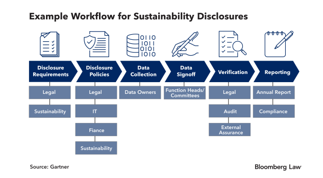 GCs can address this challenge by implementing clear ownership, accountability, and workflows that ensure reliable data collection, management, and quality control. For each disclosure, GCs should document the workflow that includes disclosure requirements, disclosure policies, data collection, data signoff, verification, and reporting.