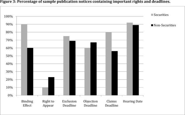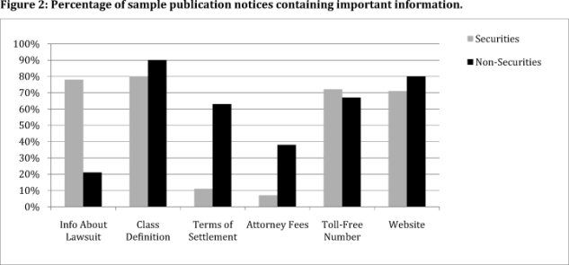The study revealed that some notices provide so few details that it is unlikely class members would recognize that they might benefit from reading them (Figure 2); it is also unlikely that those class members would learn enough from the information to decide what to do. Most securities notices failed to provide class members with details about the lawsuit, the terms of the settlement, or how much attorneys stand to make from the settlement. Non-securities notices were better on most counts, but the number of notices that did not clearly tell class members what they needed to know was still high. The most astounding finding was that 10% of non-securities notices and 20% of securities notices did not provide a definition of the class.