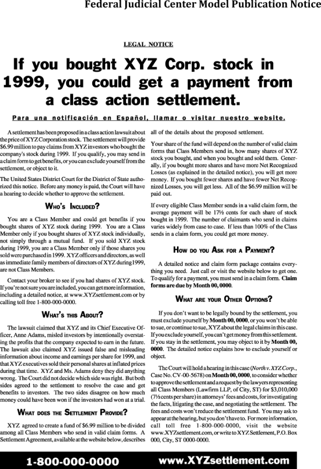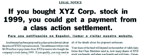 A carefully crafted headline should quickly persuade readers that they have a stake in the class action and that they will be able to understand it. Here is an example of an attention-getting headline from the securities model notice (the actual sized notice appears below):