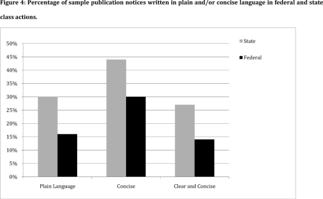 Further analysis revealed that the securities cases in the study contributed directly to the disparity between federal and state court notices. Specifically, in non-securities cases, 27% of federal class action notices and 31% of state class action notices were clear and concise. In contrast, a meager 2% of the 170 notices filed in federal securities cases provided class members with a clear, concise recitation of their rights. These findings, albeit not very surprising, seem to provide one explanation of why billions of dollars are left unclaimed in securities cases.