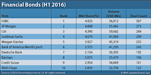 JP Morgan is still the top corporate and financial bond underwriter through the first half of 2016, but overall fixed-income deal-making volume dropped from the same period in 2015, Bloomberg data show.