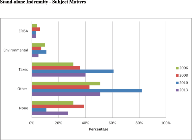 Assuming that the ABA studies reasonably reflect general practice in M&A transactions, it appears that the usage of stand-alone indemnities overall reached a peak in 2012 (as reported in the 2013 ABA study). Stand-alone indemnities for ERISA and environmental issues seem to be consistent, and relatively rare, while stand-alone indemnities for tax and “other” issues are more commonplace.