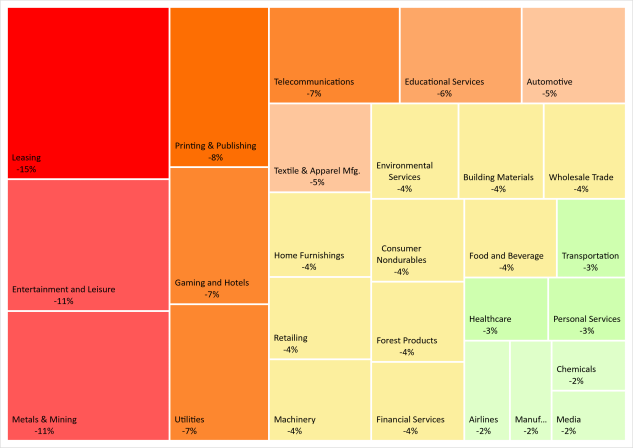 A heat map of the above markdown data reveals the relative magnitude of distress in these industries and the sectors that are most likely to be at risk for the next wave of restructuring activity.