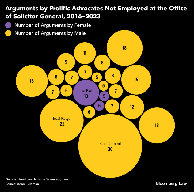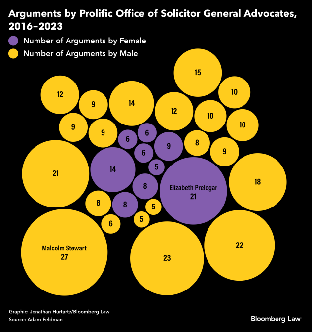 This article has been updated to reflect Lisa Blatt’s current employer, the most recent law school graduate among the sample, and to clarify in the graphic, “Arguments by Prolific Office of Solicitor General Advocates,” that Elizabeth Prelogar argued 21 times in the time period.