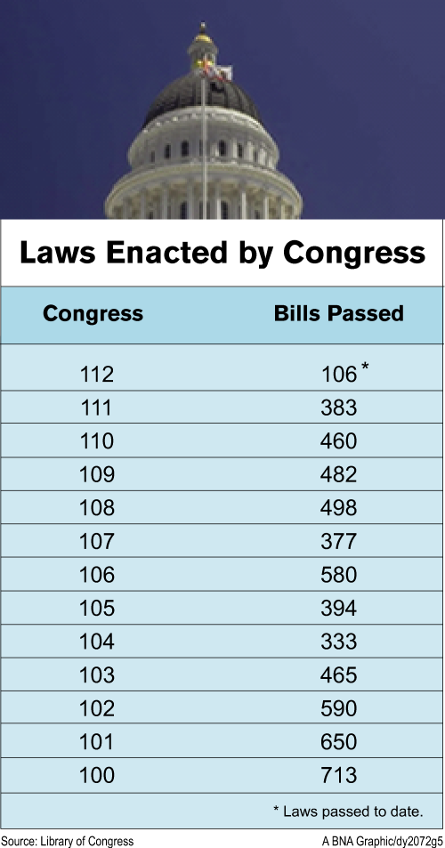 The BNA analysis used data from the Library of Congress’s “Thomas” bill-tracking website, as well as lists of public laws enacted available on the website of the Government Printing Office and in federal “statutes at large” volumes. The slower pace of lawmaking in the 112th Congress was also reflected in the timing of the laws enacted so far. The 112th Congress’ 106th law in April was the latest to reach that number of any Congress dating back to the 77th.