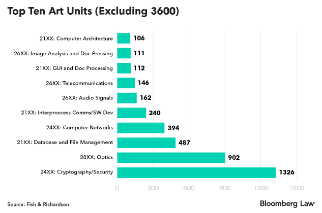 What technology do these nonbusiness method patents relate to? The data pertaining to the top 10 art units outside 3600 is quite interesting. Cryptography/security takes the lead, with a number of other traditionally “high-tech” art units not far behind.