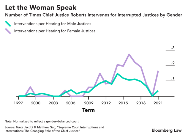 In the most recent term, Roberts intervened on behalf of female justices three times as often as for the male justices. This is appropriate since we also show the female justices are still interrupted significantly more by other justices, despite the rule change.