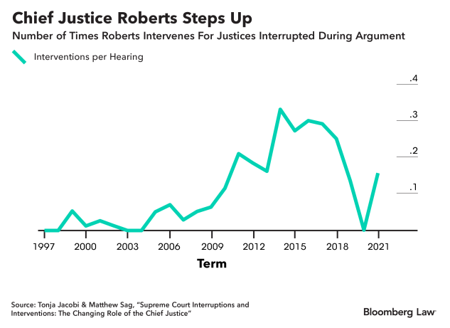 But even in this new dynamic era, we found that Chief Justice William Rehnquist hardly ever intervened in this way at oral argument. And when Roberts became chief justice in 2005, he hardly ever intervened either. But, gradually, he began stepping in to correct interruptions.